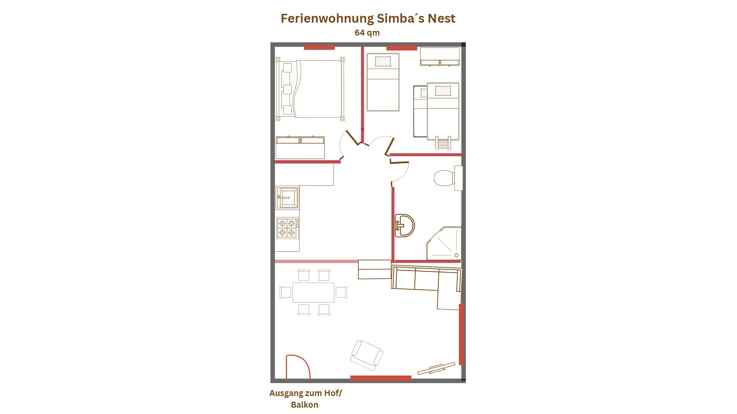 In Simbas Nest sind zwei Schlafräume, eine voll ausgestattete Küche mit Geschirrspüler, ein Bad mit Dusche/WC, ein Wohn- und Esszimmer sowie ein Südwest-Balkon.